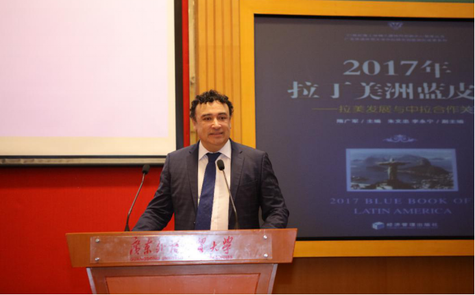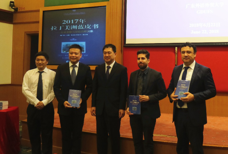 622日上午,《2017年拉丁美洲蓝皮书——拉美发展与中拉合作关系》发布会在我校行政楼国际会议厅举办。智利驻广州总领事馆馆长龙啸天(Carlos Marin San Martin)、墨西哥驻广州总领事馆副总领事臧泰(Tadeo Berjón)、蓝皮书作者代表澳门城市大学助理校长兼葡语国家研究院院长叶桂平,我校党委书记隋广军、国际合作与交流处处长蔡红、科研处副处长陈平、西语学院院长杨可、商学院院长朱文忠、商学院党委书记李华及学院领导班子,以及商学院和西语学院研究团队代表等50余人出席了本次发布会。会议由朱文忠主持。